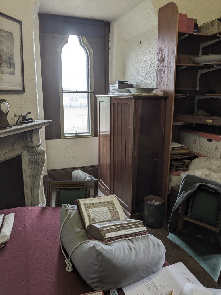 In short it was extraordinary. I signed-in at the Estates Office and collected a pass. The Assistant Archivist collected me and took me to a non-public section of the castle. I there squeezed my bag into a tiny locker and signed in for a second time, before being shown to a turret predominantly filled with dusty old boxes and files. There was one small table with a light, foam book supports, snakes and a box of Purple Nitrile Gloves.