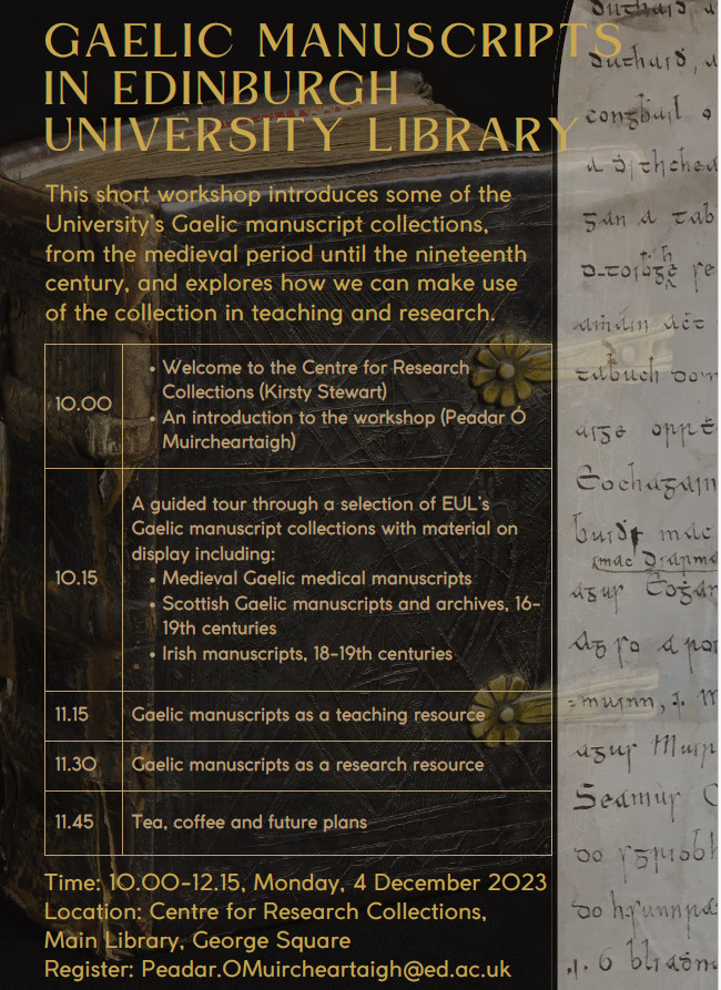 Spent a fantastic few hours on 4 December being introduced to the Gaelic manuscripts in CRC at Edinburgh University Library. There was a particularly interesting series of medical texts and fragments dating to the fifteenth and sixteenth centuries: The McBeath Gaelic Medical Manuscript, 16th century, a late-15th C Materia medica, a fragment of the treatise Maighistir Ricairdi.