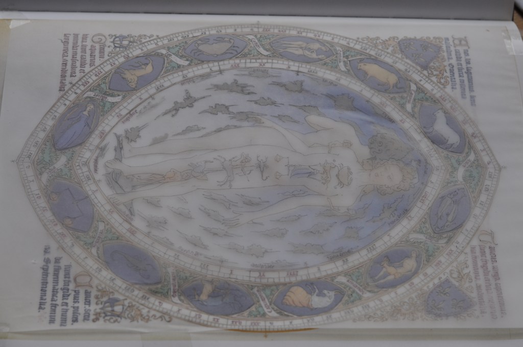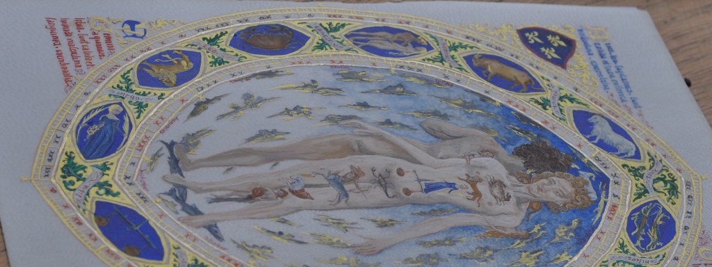 The macrocosm is what happens in the universe (e.g. the movement of the planets). While the microcosm is what happens inside man. These two spheres were, in medieval times, thought to be closely linked. The key idea behind the zodiac man iconography was, therefore, to make visible an iconographic representation of this celestial correlation. The movement of the planets were thought to effect the various parts of the body and the image that the Limbourgs’ composed is a useful diagrammatic rendering of these supposed influences. There is no escaping the macro-/micro- cosmic idea in this image since the central figures are literally enveloped in a swirling, fiery atmosphere of light, and air, and clouds.