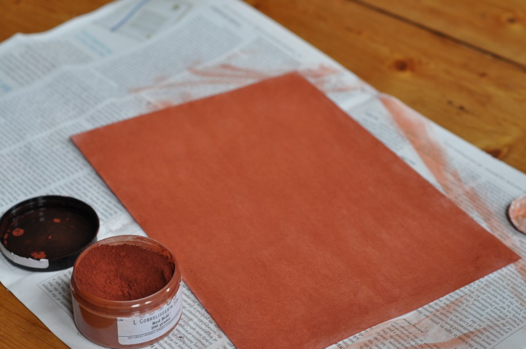 It was important in this project to follow the scale and proportions used by the Limbourg brothers and therefore the outline needed to be transferred from a to-scale tracing of the zodiac man. For this I needed to make a form of carbon paper using Armenian bole powder.