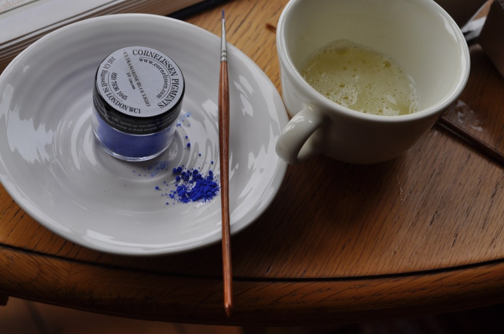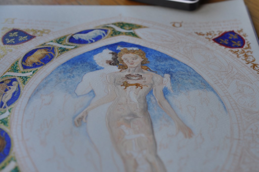 The process of painting on parchment is furthermore peculiar and unlike any painting I had done previously on paper, canvas or panel. It is strangely satisfying. The pigment can be manipulated on top of the parchment with no absorption or spread. Errors can be fairly easily corrected, except when the pigment gets trapped in the hair follicles. There is a greater possibility for building up layers of colours and manipulating the way the pigment sits on top of the skin. It is much more of a 3-dimensional image building process than I had previously considered…