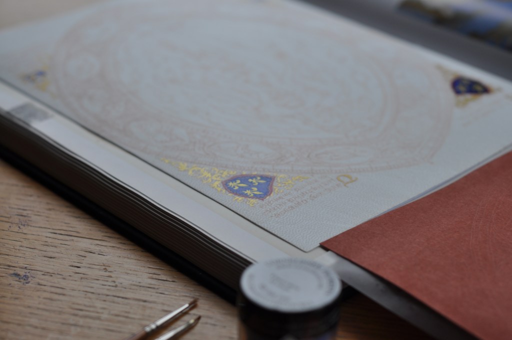 The process was slow. Even my finest brushes were at times too clumsy and it used an exhausting amount of concentration to achieve even the smallest section. I discovered that there was a necessity to working from left to right on a sheet of parchment this size, since you really didn’t want your resting hand to smudge wet pigment…