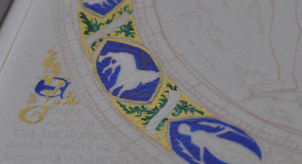 The light reflected by metal pigments, or leaf, in illuminations appears to radiate from the folio when it is turned. In this example it was not gold leaf that I used, but rather a mosaic gold which has a rather different effect – the significance of which I will come back to….