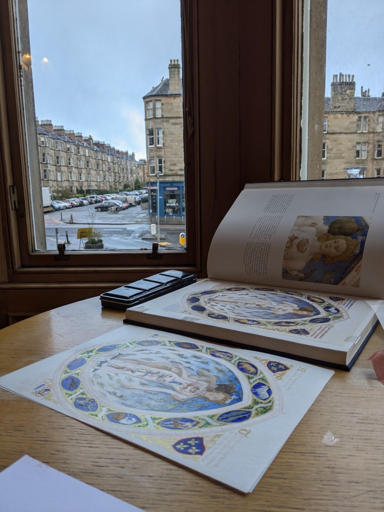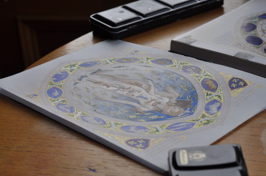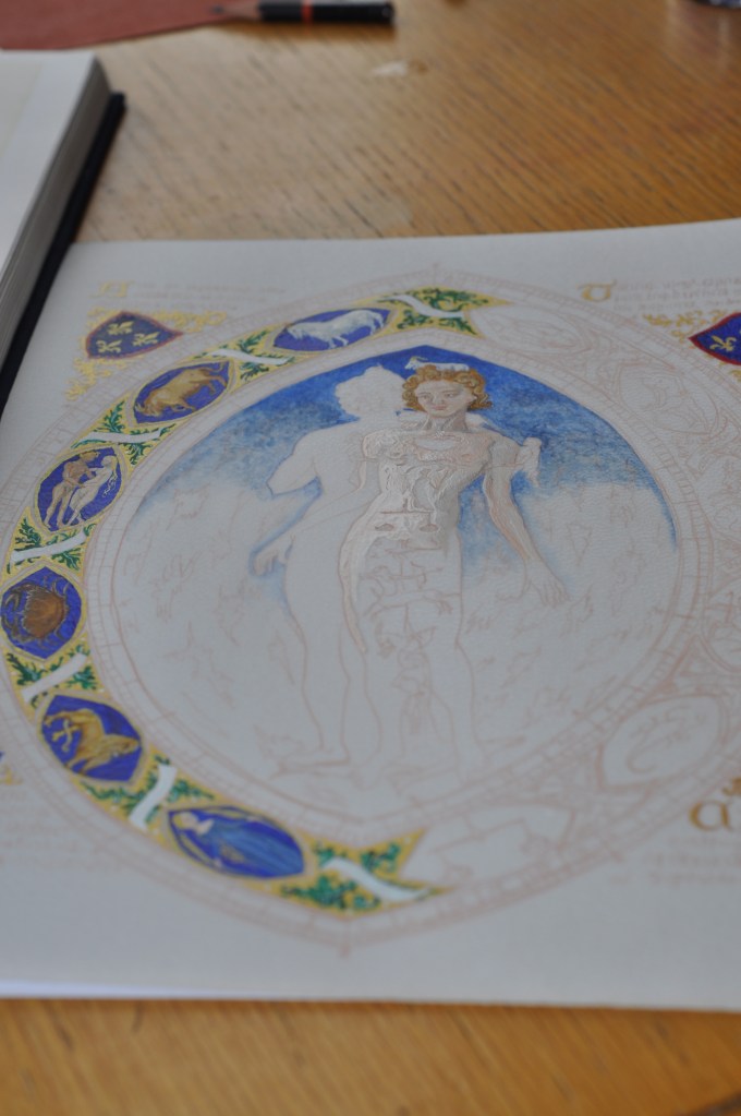 One other key factor was light. working in artificial light was not easy and therefore work times were limited to those periods with good natural light. I positioned myself by a window but had to work around my university schedule, mainly confining my illuminating time to weekends.