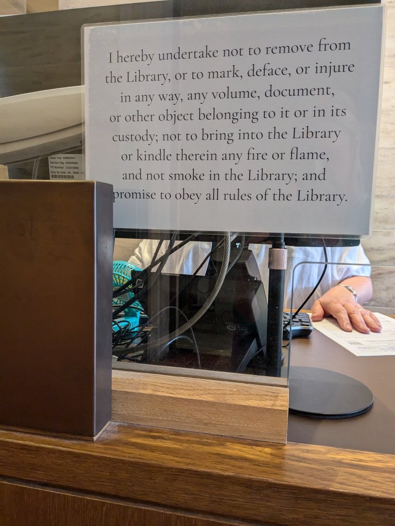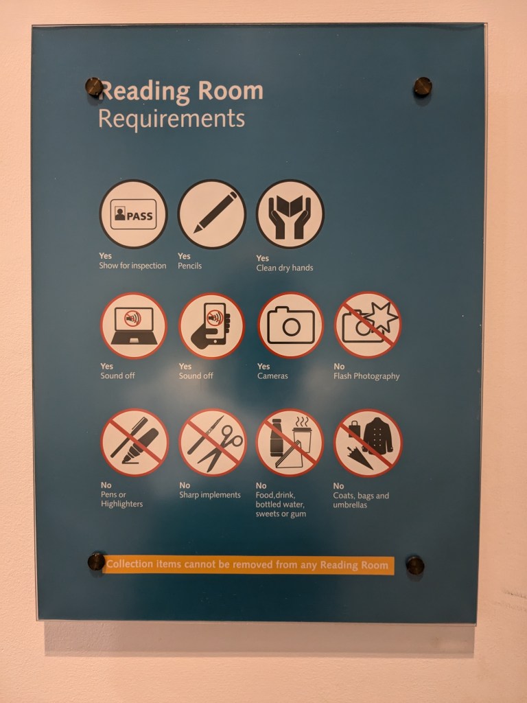 For the British library I needed a passport and driving licence (or other doc with your address). I also needed a ‘letter of introduction’ in order to access some of the manuscripts I wanted to see. Reading room rules were pretty standard (as above).