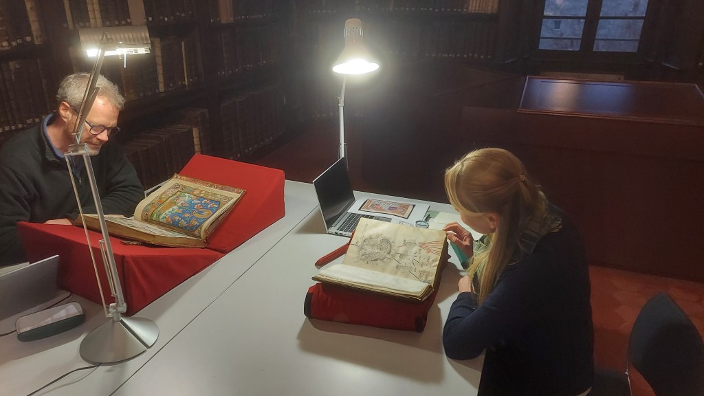 And oh the treasures within…. I did have a very clear idea of what I was coming to work on, but this was a very good example of how extraordinary it is to really examine manuscript material at first hand. The discoveries that we made would not have been possible without being able to consult the manuscript in person and discuss our findings. I did, however, spend seven hours in a stone library with no heating at 11 degrees and it was very chilly indeed! I had been warned to wear warm clothes! 🥶