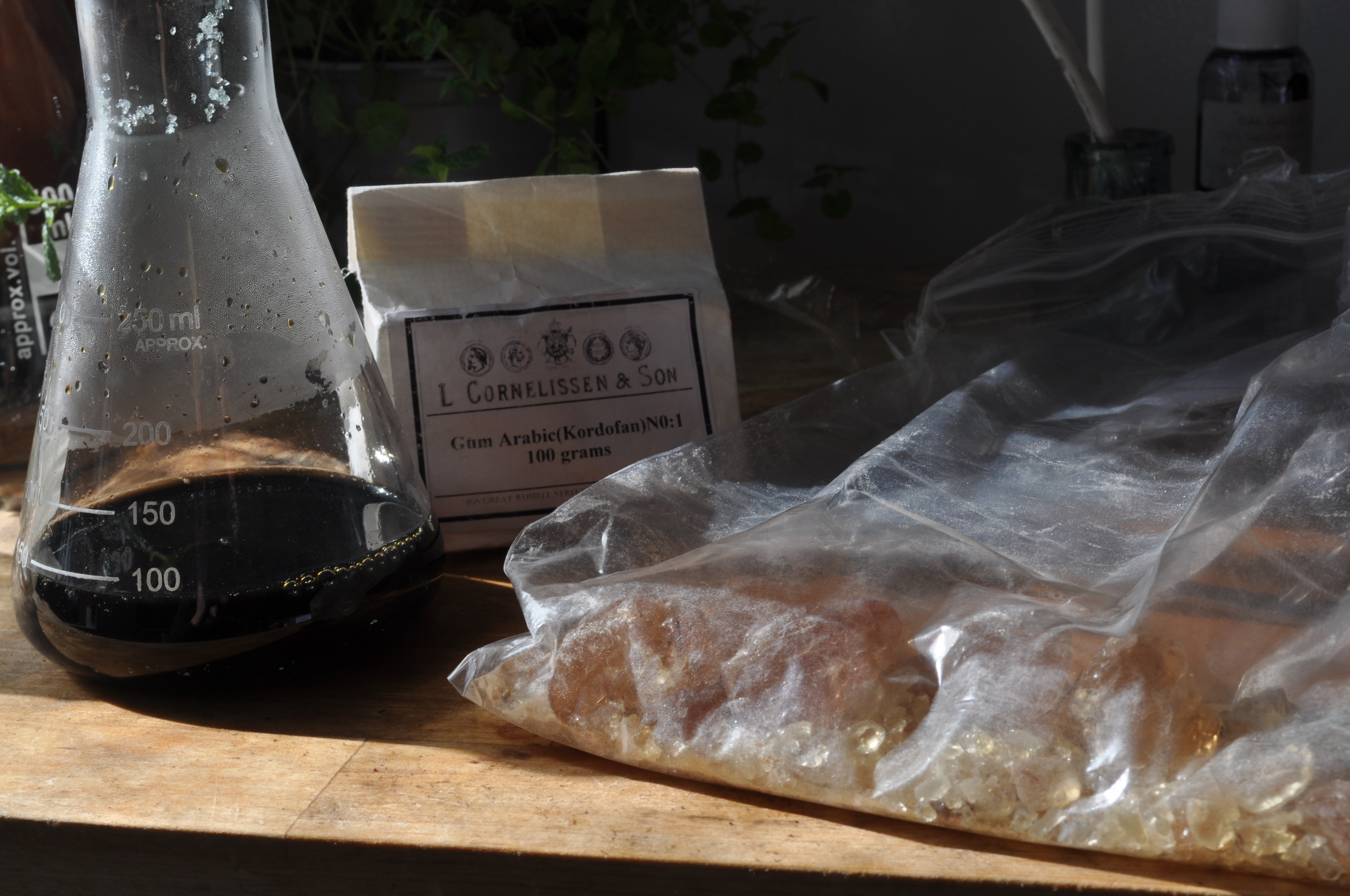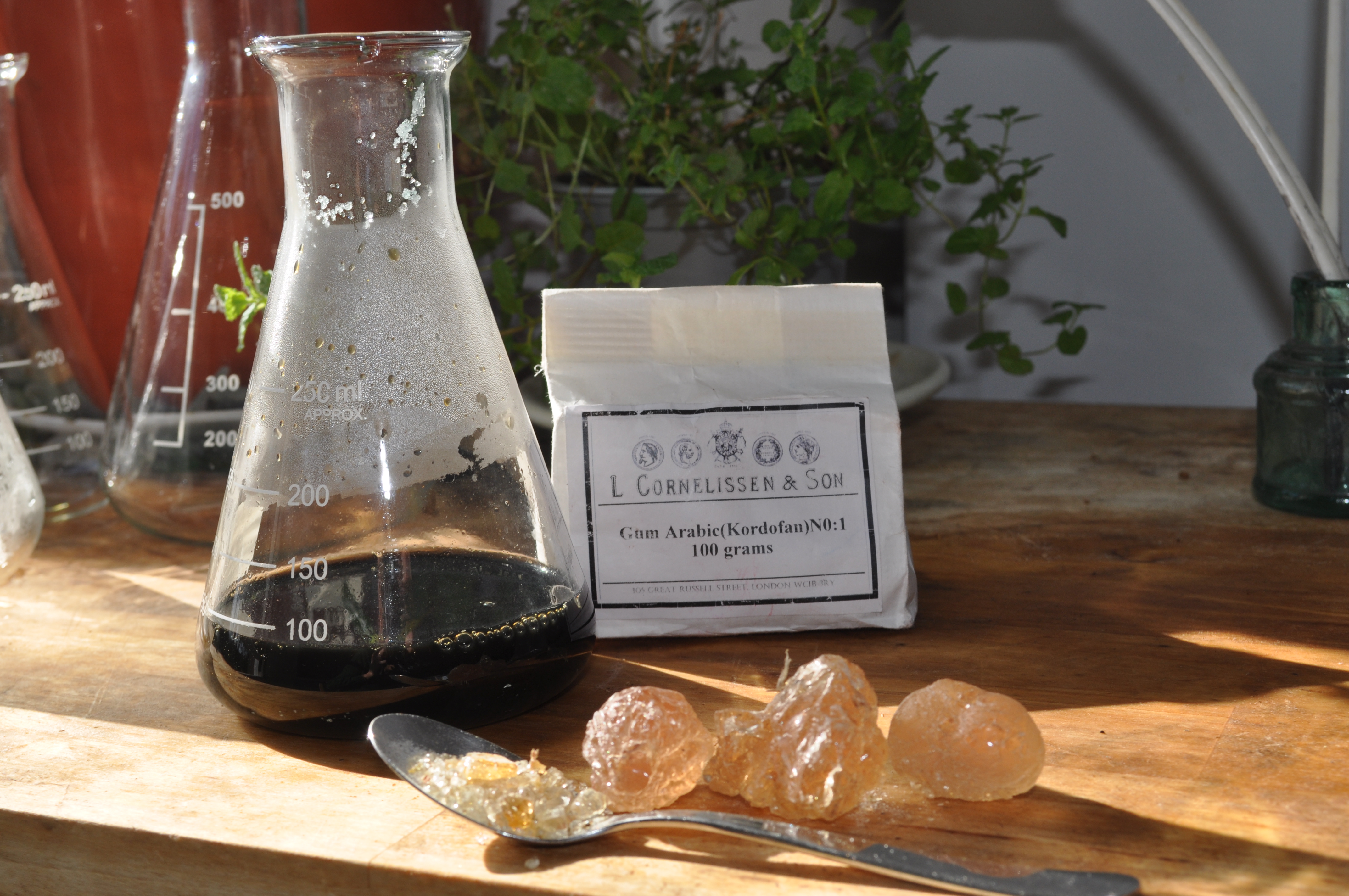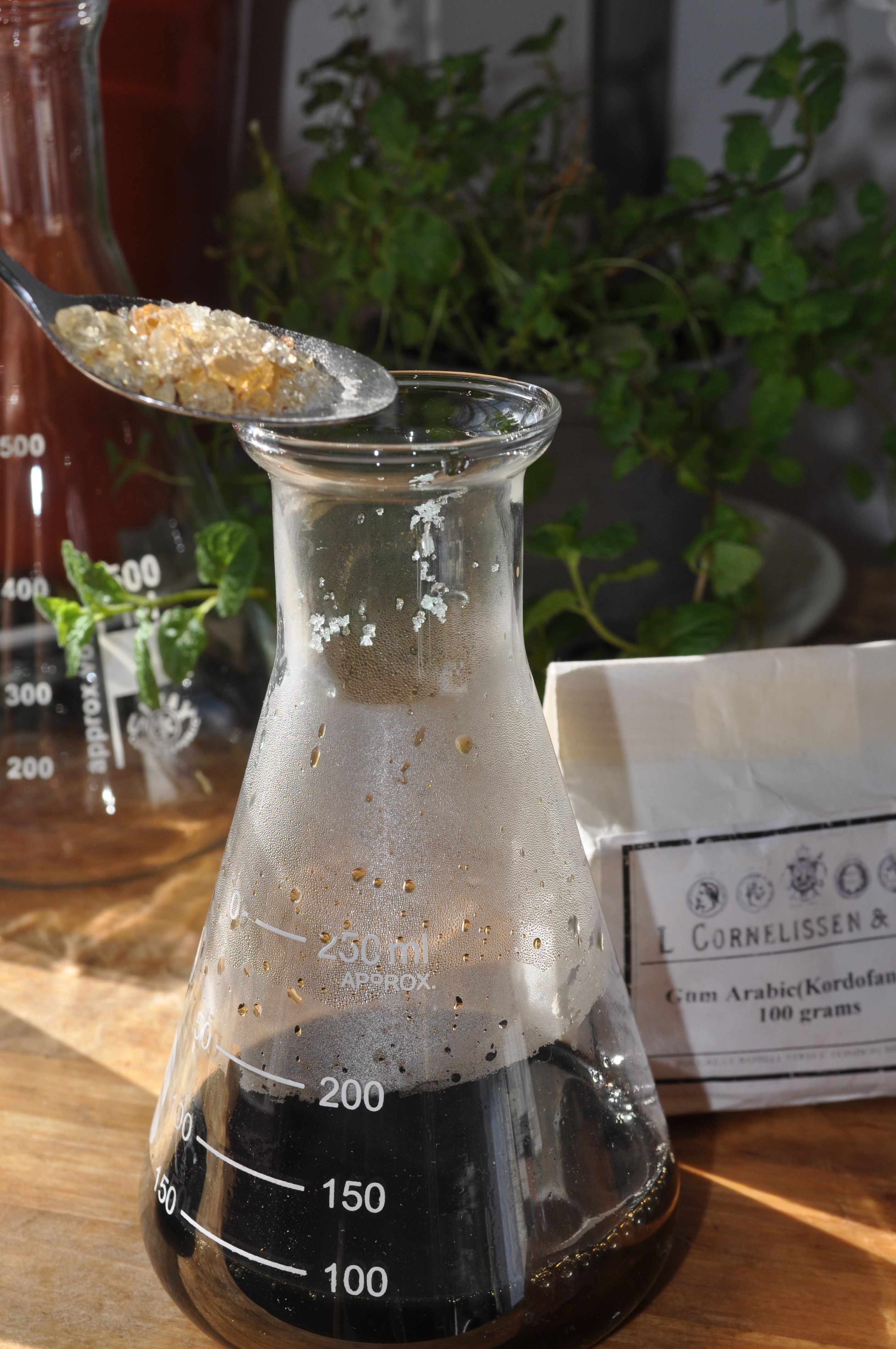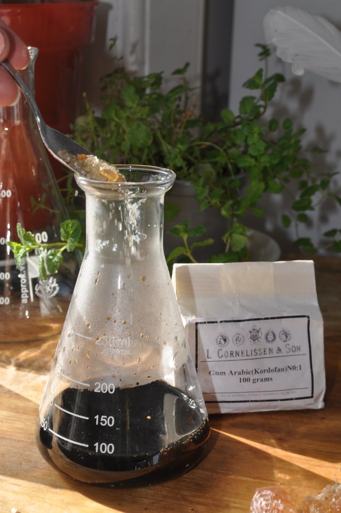 Crushed gum arabic is put into the solution. This is then stirred until it dissolved, at which point the ink was more or less completed.