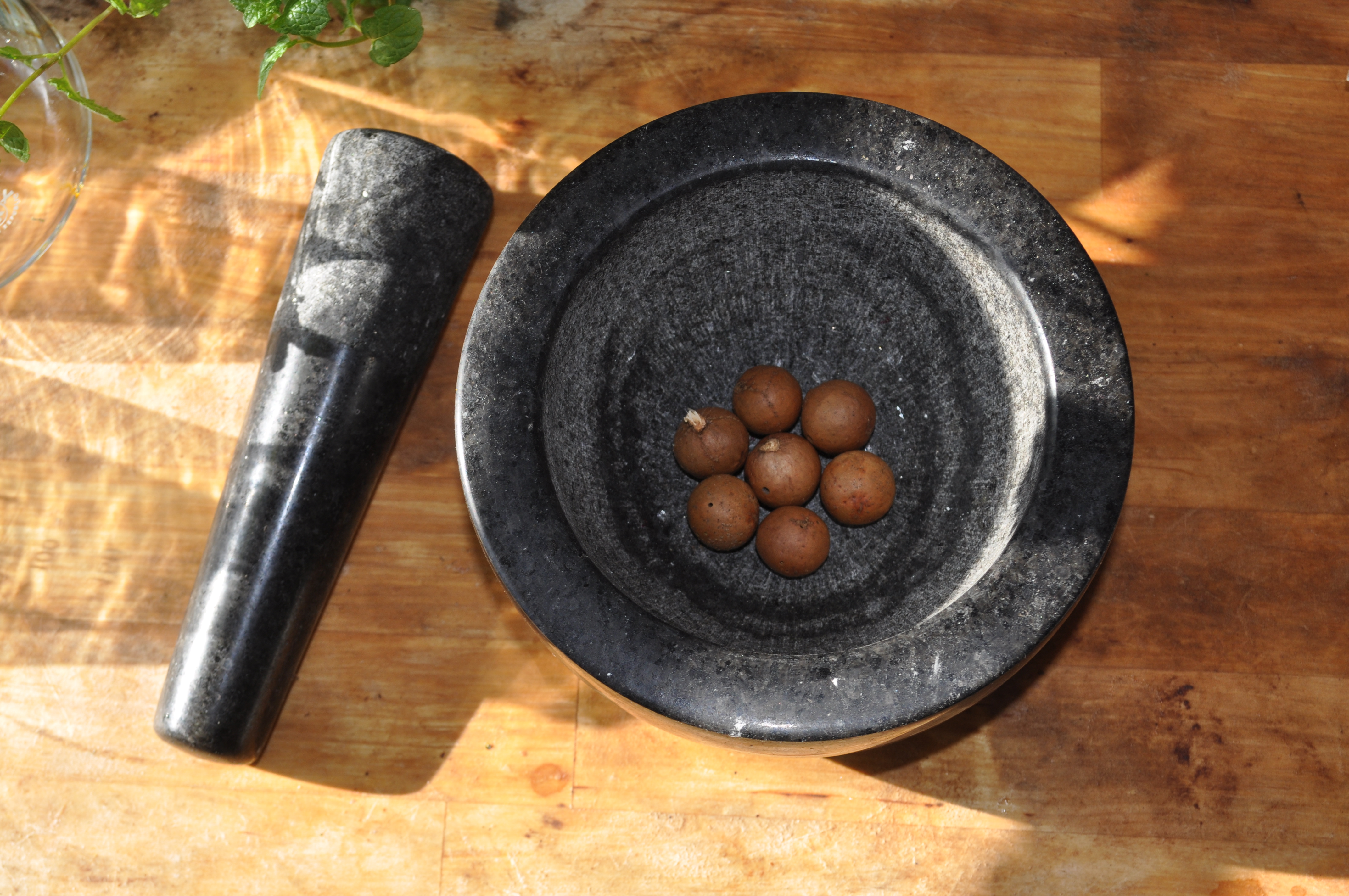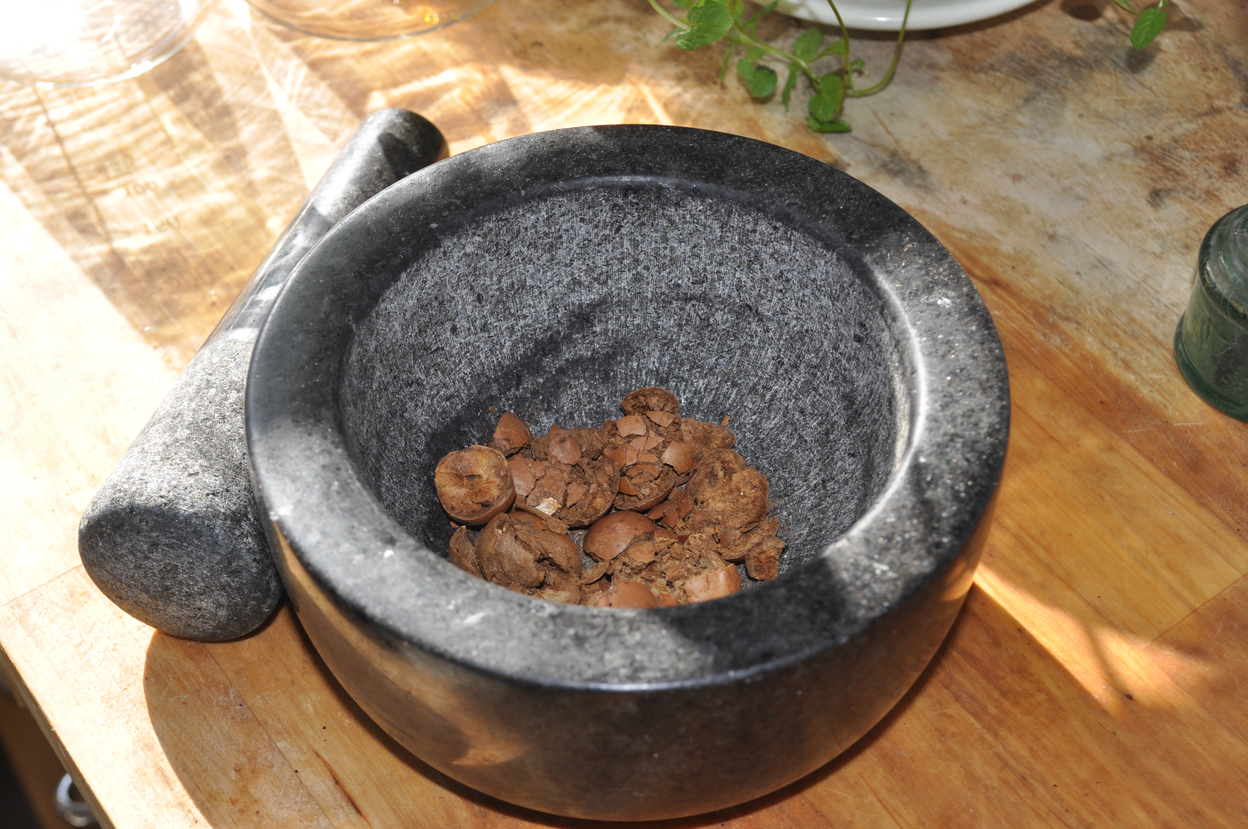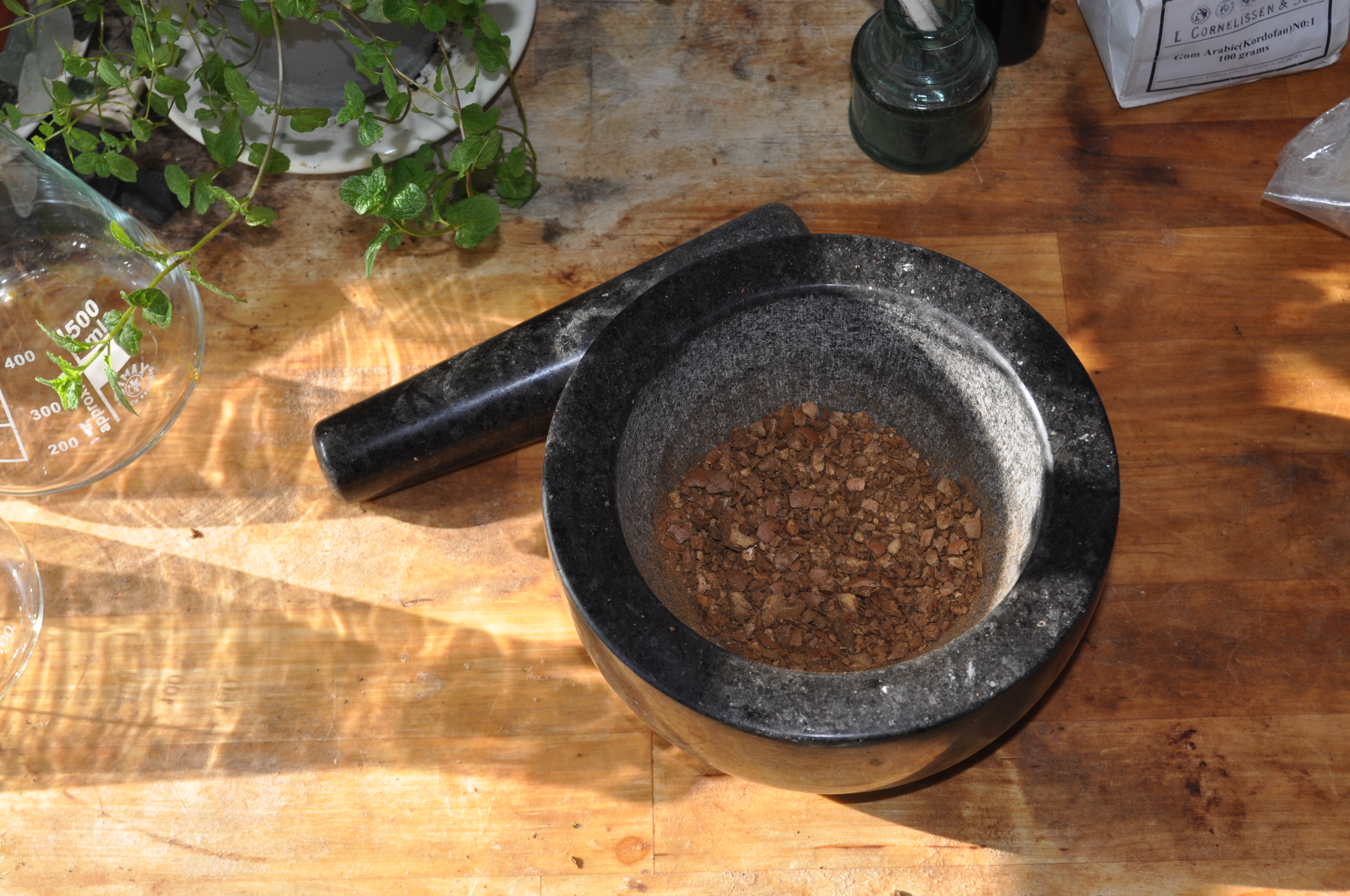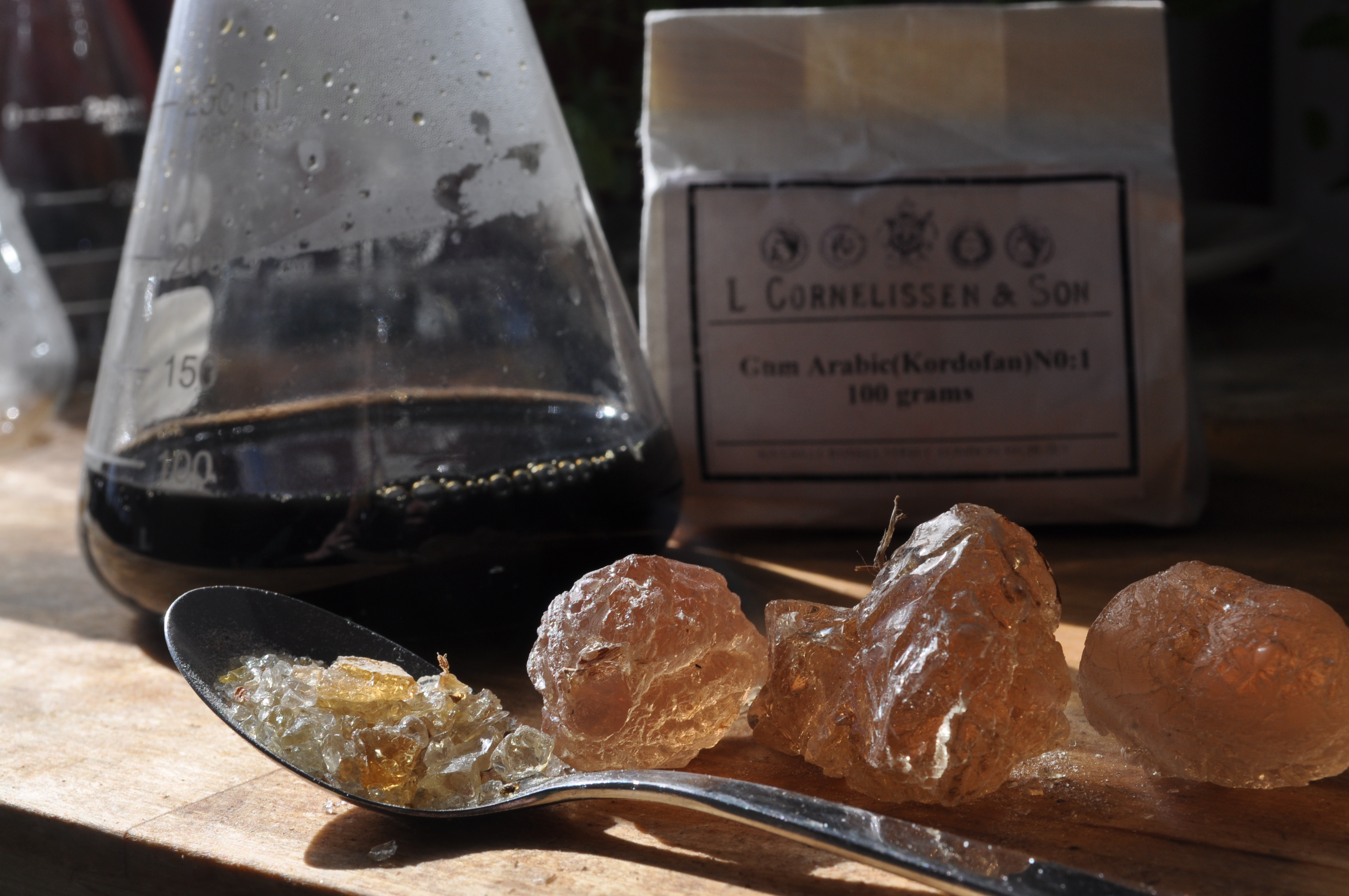 Crushed gum arabic is put into the solution. This is then stirred until it dissolved, at which point the ink was more or less completed.