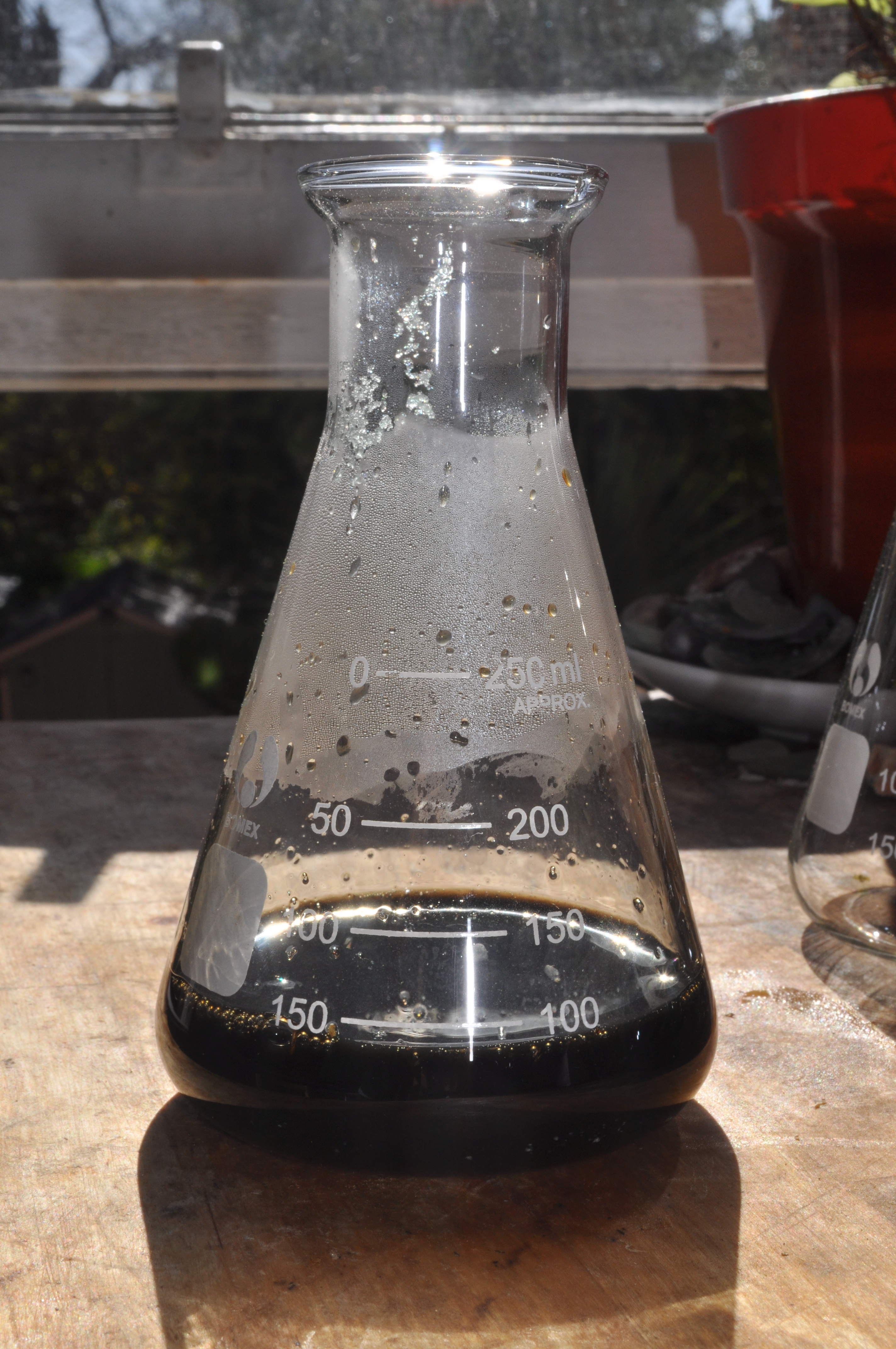 The liquid turned dark brown in about 3 minutes. Note that conical flasks are heatproof and I therefore applied some heat to speed up the process, but this could equally be done by using a small saucepan.