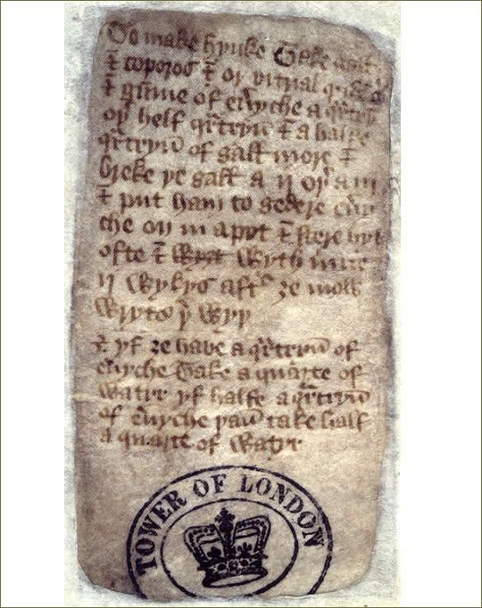 The recipe instructs that the same four substances as used above should be mixed together in equal measure: oak galls, copperas (aka iron sulfate, ferrous sulfate or iron vitriol), gum arabic, and water. The mixture should be stirred often over a two week period, after which time it is ready to use.