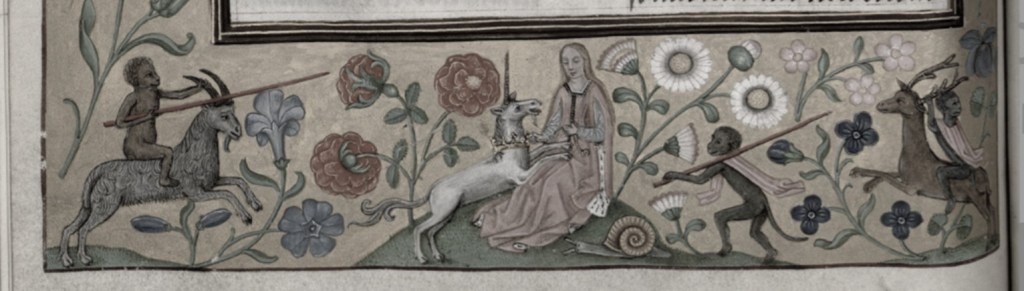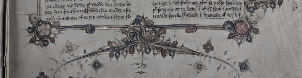I am in the early stages of mapping out a new project on distributed cognition in late-medieval manuscripts. This is, in part, informed by teaching on my current postgraduate course which looks at text/image relationships in French manuscripts. The project examines manuscripts as vehicles for navigating space, time and memory, with a particular emphasis on text and image as different modes of communication, requiring different cognitive engagement. Another focus is on the significance of place-specific biological materials. This interdisciplinary project will investigate manuscripts through the lens of living materials, place and memory, drawing on distributed cognition theory and the extended mind hypothesis. Beyond examining technical and archival evidence for the production and reception of late-medieval manuscripts, I will focus on the manuscript object as a tool, a memory aid, navigational device, a product of place-specific materials, as well as an extra-cranial instrument in systems of cognition.